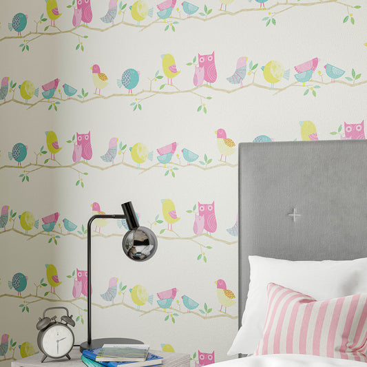 What A Hoot Wallpaper - Pink Aqua Apple & Natural - HLTF112650 - Harlequin