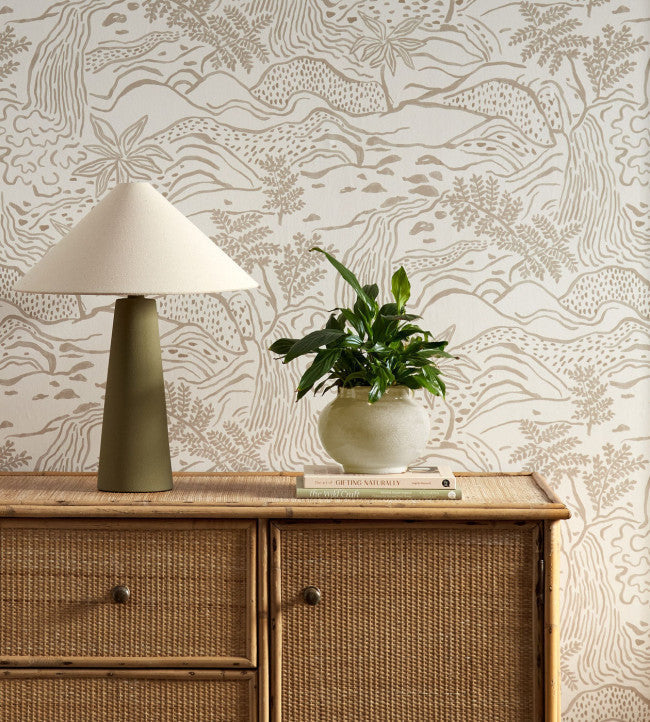 Taken from an original artwork designed for a jacquard weave and translated into a large-scale scene, Falling Foss has been repainted to give it a mural landscape feel. Telling a story of slow and easy walks through waterfalls and over gently undulating hills and riverbanks, the design offers something familiar for everyone to find. Trees, rocks, streams and brooks come together in harmony.